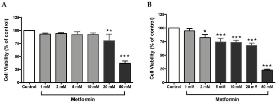 Metformin reduced cell viability in Caki-1 and Caki-2 renal cancer cell lines. (A) Caki-1 and (B) Caki-2 cells were incubated in the absence (control) or presence of metformin (1, 2, 5, 10, 20, and 50 mM) for 48 h. Cell viability was analyzed using Alamar Blue™ assay, and the fluorescence values were normalized to control and expressed as the percentage of control. Data are presented as mean ± SEM (n = 4–5 per group). * P < 0.05; ** P < 0.001; and *** P < 0.0001 vs. control.