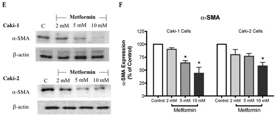 It is well-known that cell migration and invasion play a crucial role in the metastasis of cancer cells. Our results from the scratch migration study indicated that metformin inhibited cell migration of both ccRCC cell lines used. Furthermore, the Western blot analysis results revealed dose-dependent repression of α-SMA protein expression, further supporting the antimigratory effect of metformin in ccRCC cell lines (Caki-1 and Caki-2).