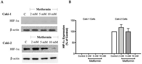 The overexpression of HIF-1α protein has been shown to be involved in the development and progression of ccRCC due to mutations in the VHL gene [28]. Therefore, targeting HIF-1α protein might be a promising approach. To investigate whether metformin could affect the expression of HIF-1α, Western blot analysis was performed in both cell lines in the absence and presence of metformin (2, 5, and 10 mM). Intriguingly, as shown in Figure 5A,B, there was no expression of HIF-1α protein with Caki-1 cells; however, Caki-2 cells expressed HIF-1α protein. Importantly, in the presence of metformin (10 mM), the protein expression of HIF-1α was reduced in Caki-2 cells compared to the control (Figure 5A). In addition, we also evaluated the expression of HIF-2α protein (data not shown); however, we did not observe any expression of this protein in both cell lines. These results showed that Caki-2 cells, which are known to express wild-type pVHL, expressed high levels of HIF-1α protein as expected; however, Caki-1 cells although classified as metastatic ccRCC and reported to be harboring wild-type VHL, did not express HIF-1α protein in our study.