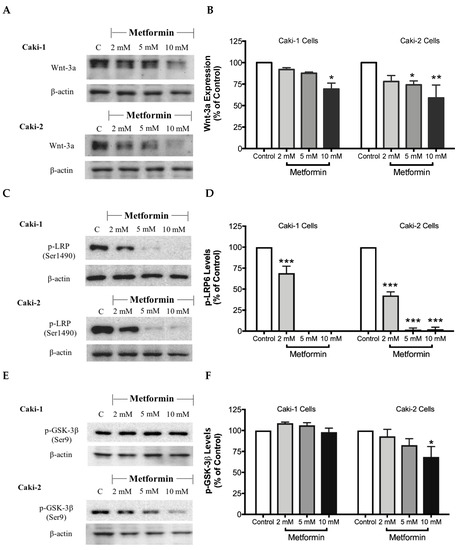 Metformin inhibited Wnt/β-catenin signaling in both Caki-1 and Caki-2 renal cancer cells. Western blot analyses are shown for (A,B) Wnt3a, (C,D) p-LRP6 (Ser1490), (E,F) GSK-3β (Ser9) and (G,H) p-β-catenin (Ser33/37/Thr41) protein in Caki-1 and Caki-2 cells incubated in the absence (control) or presence of metformin (2, 5, and 10 mM). Images are representative of three independent experiments per group. (B,D,F,H) Histograms represent pooled densitometry data normalized to β-actin expressed as the percentage of control. Data are presented as mean ± SEM. * P < 0.05; ** P < 0.001; and *** P < 0.0001 vs. control.