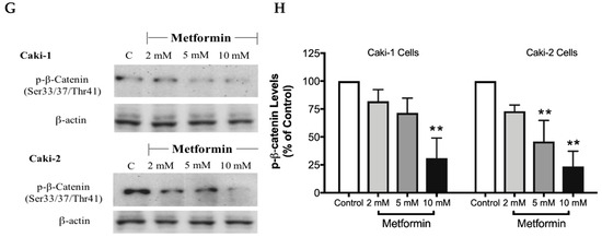 The canonical Wnt/β-catenin signaling pathway plays a critical role in various cellular and developmental processes, and its aberrant activation has been linked with some cancers including ccRCC [41]. Studies in ccRCC cell lines such as A-498, A704, and Caki-2 cells revealed a constitutive activation of the Wnt/β-catenin pathway with upregulation of β-catenin, which contributes to promoting excessive cell proliferation and differentiation [42]. Subsequently, targeting the Wnt/β-catenin signaling pathway might be a potential strategy to treat renal cancer. Thus, we evaluated here the impact of metformin treatment on the Wnt/β-catenin pathway. Our results showed a dose-dependent decrease in the protein levels of Wnt3a (Figure 8A,B), phospho-LRP6 (Figure 8C,D), and phospho-β-catenin (Figure 8G,H), in the presence of metformin in both Caki-1 and Caki-2 cells. However, the inhibition of this pathway was more pronounced in Caki-2 cells compared with Caki-1 cells. Together, these results further suggest that Caki-2 cells are more sensitive to metformin treatment compared to Caki-1 cells (Figure 8).