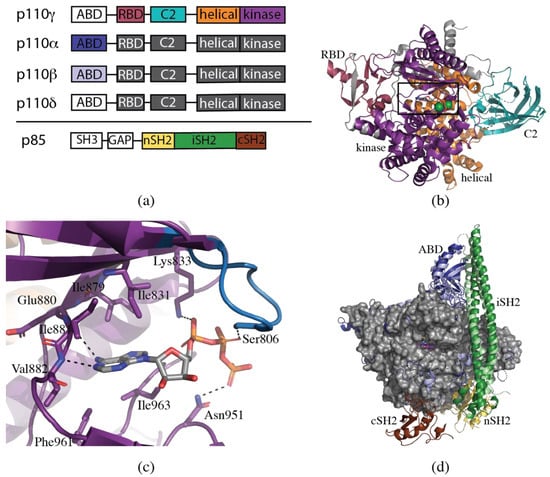 Crystal structures of murine p110δ followed in early 2010 [85]. A tobacco etch virus (TEV) protease cleavage site was introduced between the ABD and the RBD. A complex containing p110δ and iSH2 of p85α was expressed, and then the ABD cleaved with TEV protease, leaving just the N-terminally truncated ΔABD-p110δ (Figure 1d). A total of 14 structures were determined, including the holo-enzyme and the enzyme in complex with a range of pan-PI3K and PI3Kδ selective inhibitors [85].