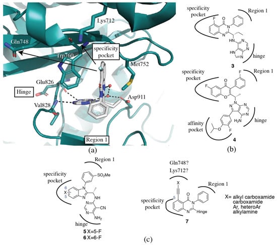 Modifications of the specificity pocket binding moiety. (a) Idelalisib (3) bound to p110δ (PDB ID 4EX0). Substituents at the 5-position of 7 are predicted to interact with either δLys712 or δGln748. (b) Structure of idelalisib (3) and umbralisib (4). (c) Structures of 5–7.