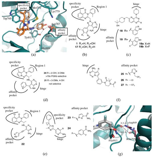 It is well established that extension of the inhibitor into the affinity pocket not only increases the potency of inhibitors but can also modulate selectivity. In the SW series of inhibitors [85,105], a meta-fluorophenol binding moiety in the affinity pocket yields a potent PI3Kδ inhibitor (1) with >300x selectivity against PI3Kα and PI3Kβ, and almost 50x selectivity over PI3Kγ (PDB ID 2WXG). A simple change to an ortho-substituted fluorophenol (17) reduces potency at PI3Kα, β and δ, while increasing potency at PI3Kγ (PDB ID 2WXH). The result is an inhibitor that maintains good selectivity over PI3Kα and β (1000x and 77x, respectively), but completely loses selectivity over PI3Kγ [85]. The hydroxyl group in 1 can hydrogen bond to both the conserved δAsp787 and δTyr813, while 17 can only form a hydrogen bond to δAsp787 (Figure 4a,b). This may explain the loss of potency at PI3Kα, β and δ, but does not explain why the inhibitor gains potency at PI3Kγ. The affinity pocket is comprised of conserved residues, making these selectivity differences difficult to rationalize.