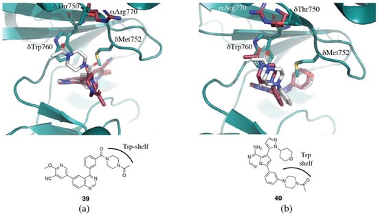 Combinations that take advantage of both the tryptophan shelf and specificity pocket have also been explored. Bulky substitutions at the 4-position of a quinoline specificity pocket binding motif (42) explore the tryptophan shelf from the specificity pocket (PDB ID 5KAE) (Figure 8) [119,120]. A recent paper from GSK have described a novel binding mode for PI3Kδ inhibitors (see compound 29), that involves a “conformational switch” of δTrp760 (Figure 5) [109]. The conformation of δTrp760 flips, such that the indole nitrogen is available to hydrogen bond with inhibitor functional groups that sit at the tryptophan shelf. Due to the anchoring hydrogen bonds to the equivalent tryptophan in PI3Kα and PI3Kγ (described in Section 3.1.2), this switch is likely to be energetically unfavorable in these isoforms.
