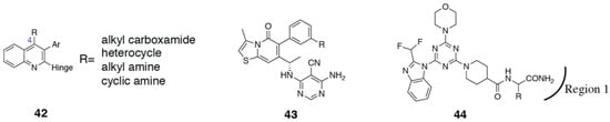 In addition to the specificity pocket, tryptophan shelf and interactions within the affinity pocket, interactions with the Region 1 non-conserved residues (also known as the ribose-binding region or hydrophobic region II) also influence selectivity. There are two key non-conserved residues in particular, which are accessible to inhibitors and are different between all four isoforms: δAsp832 (histidine, glutamate and threonine in p110α, β and γ, respectively) and δAsn836 (glutamine, aspartate and lysine in p110α, β and γ, respectively) (Figure 2c). Substitutions extending from the phenyl ring in idelalisib (3), or equivalent positions in different chemotypes, which extend toward Region 1, have been shown to influence selectivity [72,74,103]. Perry et al. [121] in their search for novel propeller-shaped chemotypes, also describe some SSAR of 43, concentrating on substituents that extend toward Region 1 (Figure 8). Substitution of a primary or secondary amine maintains potency at PI3Kδ and increases selectivity against PI3Kα and PI3Kγ, but reduces selectivity against PI3Kβ. This can be explained by interactions with interactions with the Region 1 residue, δAsn836 and equivalent in the other isoforms. δAsn836 can accommodate the substitution, but a similar interaction is disfavored in PI3Kα by the longer sidechain in αGln859. The protonatable amine favors interaction with the negatively charged βAsp856, resulting in an increase in potency, but results in a repulsive interaction with γLys890, thus improving selectivity against PI3Kγ [121]. Our group has also published a series of PI3Kδ inhibitors targeting δAsn836 with a carboxamide motif (44, Figure 8) [122]. The inhibitor showed a 40x decrease in potency when δAsn836 was mutated to an aspartate (present in PI3Kβ at the equivalent position), confirming the interaction is important for isoform selectivity.