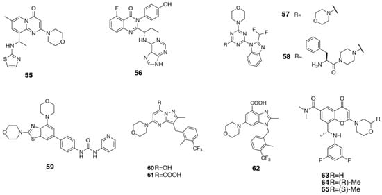 Changes in the hinge-binding region can also surprisingly affect the selectivity, as was found in the case of PI3Kδ selective inhibitors. In the chromenone series described by Barlaam et al. [69], a 2-methyl makes little difference in PI3Kβ potency compared with the non-substituted morpholine 63 (Figure 10). The chirality of the substituent also is irrelevant for PI3Kβ. However, the R-methyl (64) improves PI3Kα and γ potency, while the S-methyl (65) reduces potency for PI3Kα, γ and δ, thus improving selectivity (Figure 10) [69].