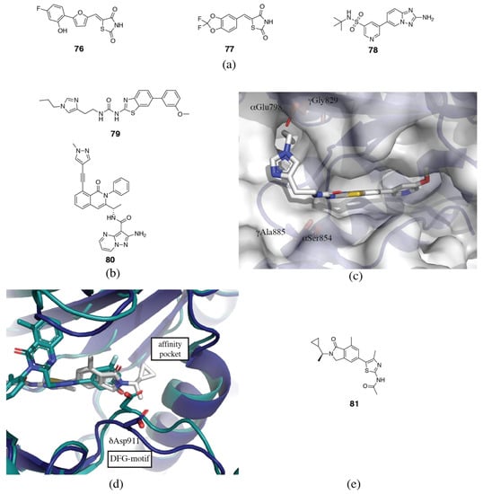 Cellzome published a series of triazolopyridines as PI3Kγ inhibitors (78, Figure 12a) (PDB ID 4AOF) [166,167,168]. The amino-triazolopyridine forms a bidentate interaction with the hinge region. The derivatization focused on the affinity pocket binding portion. As has previously been noted, affinity pocket binding motifs have a surprisingly important effect on selectivity. Substituents at the 3-position of the phenyl ring were preferred, generally showing submicromolar potency, while selectivity over PI3Kα and δ varied from as little as 4x to as much as 500x [166]. Subsequent development of these compounds focused on heterocyclic and glycinamide ureas in place of the free amino group for PI3Kγ/δ dual-selective inhibitors [169].