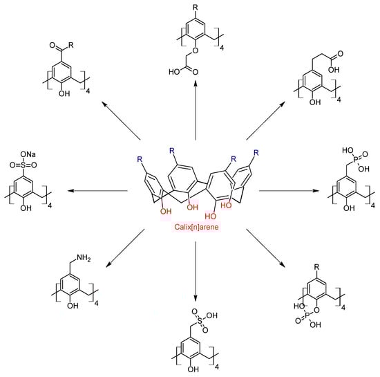 - Almi, A.; Arduini, A.; Casnati, A.; Pochini, A.; Unagaro, R. Chlomethylation of calixarenes and synthesis of new water soluble macrocyclic host. Tetrahedron 1989, 45, 2177–2182. [Google Scholar] [CrossRef]