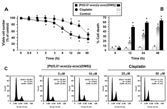 Interestingly, about 50% of cells died after only 12 h of treatment with 10 μM [Pt(O,O′-acac)(γ-acac)(DMS)], while it was necessary to incubate for about 48 h to get the same effect using 50 μM cisplatin (Figure 1A,B). Cell death, after cisplatin or [Pt(O,O′-acac)(γ-acac)(DMS)] treatment, was also measured by quantifying the percentage of cells that exhibited annexin V-FITC and/or PI fluorescence. It can be seen that cell death induced by [Pt(O,O′-acac)(γ-acac)(DMS)] was significantly higher than cell death due to cisplatin (Figure 1B).