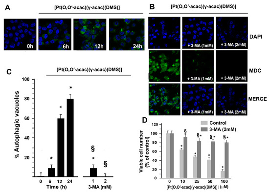 The lack of [Pt(O,O′-acac)(γ-acac)(DMS)]-induced apoptosis prompted us to study another mechanism of cell death, autophagy. Monodansylcadaverine may be used as a specific marker for autophagic vacuoles, since it accumulates in acidic compartments enriched in lipids, and staining intensity increases in cells induced to undergo autophagy. Caki-1 cells were then treated with 10 µM [Pt(O,O′-acac)(γ-acac)(DMS)] at different incubation times (6, 12, 24 h) and subsequently stained with MDC and DAPI (for nuclei localization). A time-dependent increase of fluorescence signals was evident in autophagic vacuoles of [Pt(O,O′-acac)(γ-acac)(DMS)]-treated cells (Figure 3A). Fluorescence intensities of autophagic vacuoles were drastically decreased by preincubating cells with crescent concentration of 3-methyladenine (3-MA), a specific inhibitor of autophagy (Figure 3B,C). Furthermore, the pretreatment with the autophagy inhibitor, 3-MA, or autophagolysosome fusion inhibitor significantly decreased cell death due to [Pt(O,O′-acac)(γ-acac)(DMS)] (Figure 3D).