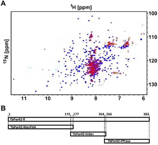 Nuclear magnetic resonance (NMR) spectroscopy and construct design of TbPar42. (A) Superposition of a 1H-15N-total correlation spectroscopy (TROSY) of 2H-13C-15N-TbPar42 (blue) and a 1H-15N-hetero single quantum coherence (HSQC) of 15N-TbPar42 (red). (B) Design of expression constructs (horizontal bars) for full length protein (TbPar42-fl), N-terminus with forkhead association (FHA) domain (TbPar42-NterFHA) and PPIase domain (TbPar42-PPIase). The corresponding residue numbers are given at the top of Figure 1B.