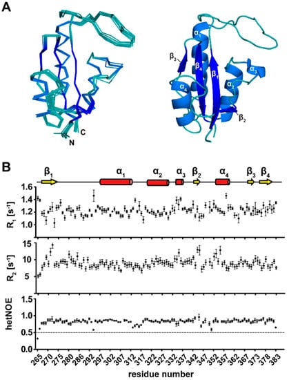 The PPIase is buildup of four α-helices and four β-strands (Figure 2A,B). The first N-terminal β-strand comprises amino acids from Arg267 to Val274, and is followed by a long loop, which extends from Lys275 to Arg296. The adjacent α-helix 1 (Ser297 to His312) is separated through a small stretch of residues from α-helix 2 (Leu320–Phe330). Within the following thirteen residues, α-helix 3, which comprises only four residues (Gly334–Lys337), was identified by chemical shift data. Due to a lack of a typical helix-NOE pattern and fast exchanging amide protons in this helix, it is likely to be considered as α-helical turn. The second β-strand from Gly343 to Val345 is connected to α-helix 4 (Gly353 to Phe359) by a short loop. β-strand 3 is formed from Val370 to Thr372, and is followed by a short loop that turns into the fourth β-strand (Gly375–Glu381). Analysis of 15N-relaxation data reflecting the motion of the backbone N-H vector (Figure 2B) indicated that all secondary structure elements are rigid, and even the extended PPIase loop regions (β1-α1 and β2-α4) lack significant internal mobility.