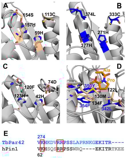 A comparison of both structures (Figure 3A,B) indicates that well-conserved residues of Pin1-like parvulins, e.g., the histidine motif (His59 and His157 in hPin1; His271 and His377 in TbPar42), as well as a characteristic cysteine within the catalytic cleft (Cys113 in hPin1; Cys333 in TbPar42), are located at the same spatial positions within both folds. The hPin1 Ser154 (Figure 3A), described as a part of the catalytic tetrad [34] is replaced by Leu374 in TbPar42 (Figure 3B). In the catalytically active but non-phosphorylation specific parvulin hPar14, a phenylalanine (Phe120) can be found at this position (Figure 3C). Thr372, the counterpart of which in Par14 was associated with the catalytic network [35], is also conserved in the TbPar42-PPIase structure. Residues Leu122, Met130, and Phe134 of Pin1, which are located at the concave side of the β-sheet core, constitute a hydrophobic binding pocket for the substrate’s proline ring moiety. At the same spatial positions, Leu342 and Phe354 can be found in the TbPar42-PPIase structure, whereas the methionine is exchanged by a tyrosine (Tyr350), Figure 3D. Phosphorylation-specific parvulins exhibit an extended α1-β1 loop, with a basic amino acid cluster important for the binding of the phosphate group of substrates. A homologous loop is also present in the structure of TbPar42-PPIase (Figure 3E).