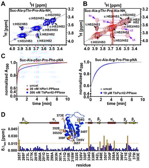 The protein failed to compensate the loss of ESS1 function in yeast (as hPin1 does), and also lacked isomerase activity against a pThr containing substrate, which was used to verify the activities of TbPin1 and AtPin1 [1]. We confirmed this lack of activity of TbPar42-PPIase by exchange spectroscopy (EXSY) experiments using an alternative substrate (Figure 4A,B), and by isomerase activity studies using a protease coupled assay (Figure 4C). In the latter experiment, a considerable ensemble of substrates containing pSer or pThr residues preceding proline were used to track activity. In addition, peptides containing negatively charged (Glu, Asp) positively charged (Arg), or uncharged (Ser, Gln, Phe) residues at the Xaa-Pro motif were assayed to test a putative sequence dependency of TbPar42’s substrate activity for non-phosphorylated motifs (Figure 4C(right)). However, no cis/trans-activity could be detected against any of these substrates. From all the current data, we may conclude that the PPIase domain of TbPar42 seems to have no enzymatic function within the protein. Although TbPar42 seems to be catalytically inactive, titration experiments with a Suc-Ala-pThr-Pro-Ala-NH2 peptide showed chemical shift perturbations in the 2D 1H-15N hetero-single-quantum-coherence (HSQC) spectra of the PPIase domain, Figure 4D. Thus, the substrate was capable of binding to the enzyme. Residues affected by peptide addition were in near proximity to the proposed proline binding site (Thr265, Gly334, Val345, Thr349, Glu352, Gly353, Phe359 Glu373), but KD values were in the millimolar range (~10 mM).