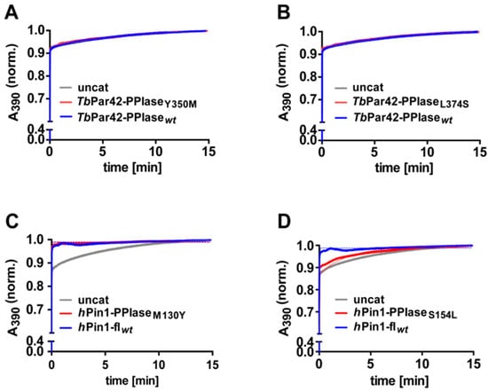 PPIase assays using 75 µM of the peptide Suc-Ala-pThr-Pro-Phe-pNA in the presence and absence of different PPIase constructs. Absorption curves of uncatalyzed reactions are highlighted in gray color. Catalyzed reactions are shown (A) in presence of 10 µM TbPar42-PPIaseY350M (red) and 10 µM TbPar42-PPIasewt (blue); (B) in presence of 10 µM TbPar42-PPIaseL374S (red) and 10 µM TbPar42-PPIasewt (blue); (C) in presence of 10 µM hPin1-PPIaseM130Y (red) and 2 µM full length (fl) hPin1-flwt (blue); (D) in presence of 10 µM hPin1-PPIaseS154L (red) and 2 µM full length (fl) hPin1-flwt (blue).