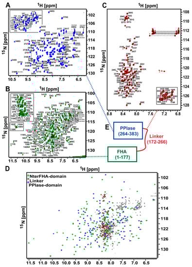 The domains of TbPar42 do not interact with each other (A) Fully assigned 1H-15N-HSQC spectrum of the PPIase domain264-383. (B) Fully assigned 1H-15N-HSQC spectrum of the N-terminal extended FHA domain1–177. (C) 96.6% assigned 1H-15N-HSQC spectrum of the linker172–266 region. (D) Overlay of the TbPar42 full-length TROSY spectrum with the HSQC spectra of the separately analyzed domains and the linker of TbPar42. (E) Scheme of domain organization.