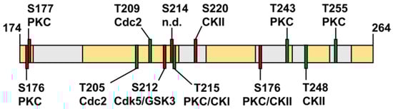 Phosphorylation sites predicted by Netphos-3b1. Schematic drawing of the linker region (residues 174 to 264) in yellow. Putative helices are represented by gray horizontal bars. Predicted phosphorylation sites are depicted as red (serine) and green (threonine) vertical bars. The respective phosphorylated residues and their putative modifying kinases are marked (PKC = protein kinase C; CKI/CKII = casein kinase I/II; Cdc/Cdk = cyclin-dependent kinase; GSK3 = Glycogensynthase kinase 3).