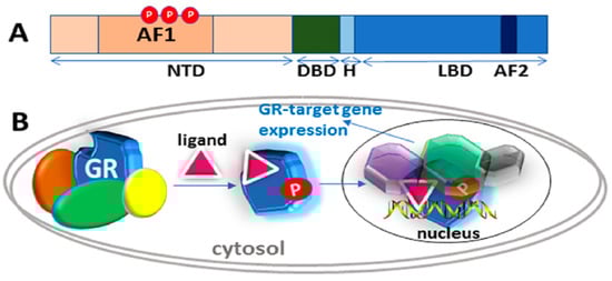 The human GR gene consists of 9 exons located on chromosome 5 [20,21]. Like other steroid hormone receptors (SHRs), the GR consists of three well-known major functional domains: N-terminal (NTD), DNA binding (DBD), and ligand-binding (LBD) (Figure 1A). DBD and LBD are separated by a short intrinsically disordered (ID) amino acid sequence known as the “hinge” region [13]. Within the NTD and LBD are two transcription activation function regions, AF1 and AF2, respectively [13]. AF2 is strictly ligand-dependent whereas AF1 is ligand-dependent in the context of the holo-GR but is constitutively active and can regulate GR-target genes in a ligand-independent manner when the LBD is removed [9,13]. In other words, the AF1 can act constitutively in the absence of the LBD and is quite active in stimulating transcription from simple promoters containing cognate GR binding sites [13]. With the discovery of a large cohort of GR forms with unique expression, gene-regulatory, and functional profiles [6], the traditional view that a single GR protein regulates the effects of glucocorticoids has changed in recent years. Alternative exon splicing and translation initiation sites in the human GR mRNA result in a number of receptor sub-types [6].