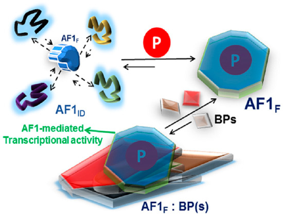 A proposed model of the effect of phosphorylation on the folding of intrinsically disordered (ID) AF1 domain of the glucocorticoid receptor. AF1 exists in equilibrium with mostly unstructured AF1ID and a small fraction of folded (AF1F) conformers. Due to AF1’s site-specific phosphorylation (P), the equilibrium is shifted in favor of folded conformers. This structural rearrangement in AF1 creates surfaces well suited for interaction with coregulatory binding partner (BP) proteins (shown by different shapes and colors). The interaction with these BPs results in the regulation of AF1-mediated transcription of GR target gene(s). Based on references [62,72].