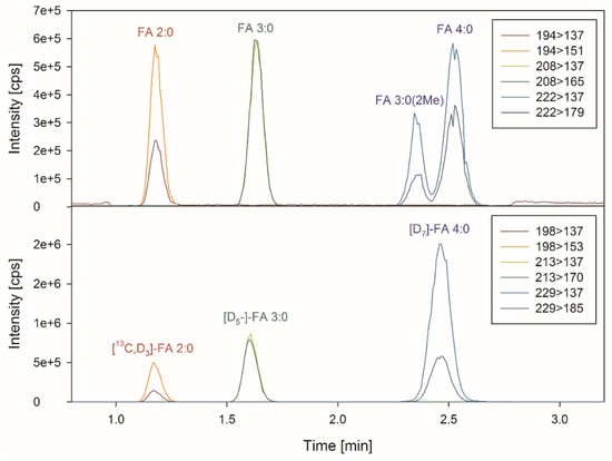The aim of the current study was to develop an accurate, robust, and fast method for the quantification of SCFA (up to four C-atoms) in fecal samples by LC-MS/MS. The SCFAs were determined in an aliquot representing 100 µg DW. The derivatization of SCFAs to 3-nitrophenylhydrazones (3NPH) was performed according to the protocol described by Han et al. [9]. The derivatization reaction was stopped by the addition of formic acid. For accurate quantification, stable isotope labeled SCFAs were added to the derivatization as internal standards (ISs) for each straight chain SCFA (i.e., [13C,D3]-FA 2:0, [D5]-FA 3:0, [D7]-FA 4:0).