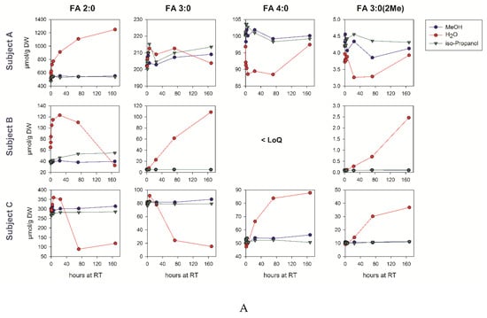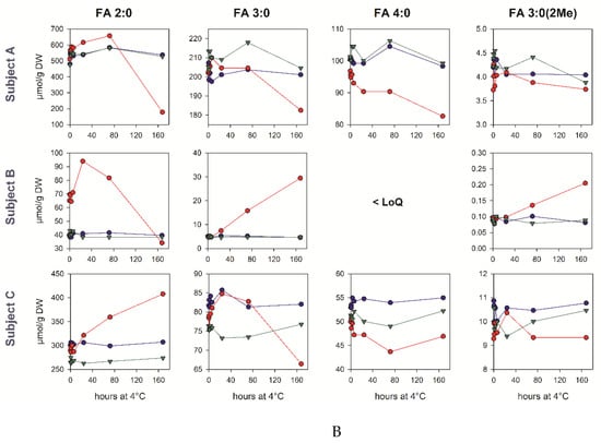 As microbial activity may continue after defecation, we asked whether the SCFA levels are altered by sample storage at room temperature or 4 °C. Moreover, it was tested if the potential SCFA metabolism in the fecal samples can be inhibited by the addition of organic solvents. Therefore, we homogenized the fecal samples of three volunteers within 3 h after defecation, and prepared aliquots in water, 70% methanol, and 70% isopropanol with identical concentrations. The aliquots were stored up for to 7 days and the SCFA concentrations were quantified (Figure 2). Huge differences were observed between the subjects concerning the concentrations and stability of the individual SCFAs during storage. In the aqueous samples, the SCFA concentrations, especially those of acetate in subject B, rose about two-fold within six hours. For this sample, the initial FA 2:0 concentration was ~50% higher than in the methanol/isopropanol aliquots. While the SCFA concentrations typically rise during the storage of aqueous samples, long-term storage for several days may also result in a significant drop, for example, below 50% of the initial FA 2:0 concentration after three days for subject C. These changes are substantially lower in the cold. The addition of both isopropanol and methanol stabilizes the SCFA concentrations even at room temperature.