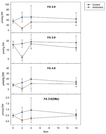 SCFA levels in the colon content of SPF mice treated with antibiotics. Specific pathogen-free mice were treated for two days with a combination of vancomycin and metronidazole (antibiotics). After treatment, the mice obtained a regular chow diet without antibiotics for an additional 2 or 12 days. The colon content was analyzed at the indicated time points (n = 6 each data point). For three samples with antibiotic treatment, the (day 2) FA 4:0 and FA 3:0 (2Me) concentrations were below limit of detection LoD; for these samples, two-thirds of the LoD were imputed.
