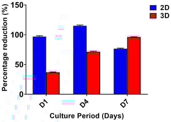 The proliferation of the invasive breast cancer cells (MDA-MB-231) on 2D and 3D constructs (Figure 2) were evaluated by alamarBlue assay. The cells were proliferative over time in 3D matrices, while the peak of cell growth in 2D was revealed on the 4th day (115.2 ± 1.35%) followed by a reduction in proliferation rate. The cells in 2D have limited surface area, therefore after a certain confluence level, the viability of cells decreases due to restricted space to multiply further. The proliferation of cells in 3D increased over time and was higher than 2D on the 7th day (96.22 ± 0.40).
