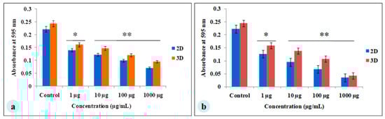 The MDA-MB-231 cells were cultured for 7 days on A. myliita silk constructs in vitro, and subjected to cyclosaplin and doxorubicin treatment for 48 h. The cell viability was studied for various drug concentrations (1–1000 µg/mL) of the peptide (Figure 3a) and doxorubicin (Figure 3b). In 2D culture, the IC50 concentration for doxorubicin was 2.8 ± 0.06 μg/mL, whereas the IC50 of cyclosaplin was 16.86 ± 0.09 μg/mL. In 3D culture, the IC50 concentration for doxorubicin was 16.44 ± 0.1 μg/mL, while the IC50 of cyclosaplin was 89.27 ± 0.2 μg/mL. The higher concentrations of cyclosaplin and doxorubicin were needed to achieve the IC50 value in human breast cancer cells grown in 3D (Table 1).