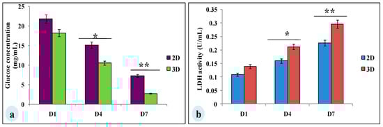 To evaluate whether glucose metabolism of MDA-MB-231 cells is altered in silk constructs, the collected spent media on 1, 4, or 7 days after seeding and glucose concentration was measured. In 3D silk constructs, the glucose concentration on the 7th day was 2.76 ± 0.03 mg/mL, compared to 2D (7.3 ± 0.08 mg/mL). In 3D silk constructs, a 1.3-fold increase in LDH activity was observed on the 7th day in comparison to 2D. Thus, the glucose consumed and LDH activity was higher in cells grown in 3D constructs than those in 2D (Figure 4).