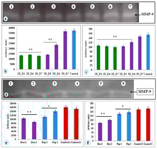 MMP-9 plays a vital part in the progression of tumor and angiogenesis. To determine the MMP-9 activity, SDS-PAGE gelatin zymography was performed. The spent media of day 1, 4, and 7 of both the constructs (2D and 3D) were assessed for MMP-9 activity (Figure 5). MMP-9 activity was observed in both the 2D and 3D cell cultures. The cells cultured on 3D silk constructs showed higher activity (1.4-fold increase) on the 7th day compared to 2D cultures (Figure 5a–c). The 3D silk constructs were therefore, used for the experimental drugs studies. The spent media of the cyclosaplin and doxorubicin (1, 100 µg/mL) treated 3D constructs were evaluated for MMP-9 activity. The cyclosaplin and doxorubicin treated MDA-MB-231 cells showed a 1.2- and 1.5-fold decrease in MMP-9 activity in 3D constructs, respectively (Figure 5d–f).