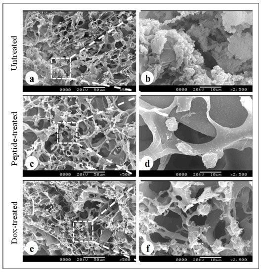 The scanning electron micrographs revealed formation of cellular aggregates, distributed homogenously within the 3D silk constructs after a culture period of 7 days in untreated constructs (Figure 6a). Both cyclosaplin (peptide) (Figure 6c,d) and doxorubicin (Figure 6e,f) treated (100 µg/mL) constructs exhibited few individual cells that were less in number. Cell shrinkage was also observed in both the treated conditions.