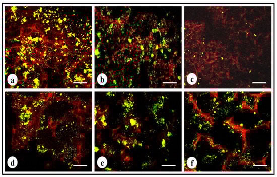 Live–dead stained confocal micrographs showing morphology of MDA-MB-231 cells: (a,d) untreated MDA-MB-231 cells, (b) doxorubicin treated cells (1 µg/mL), (c) doxorubicin treated cells (100 µg/mL), (e,f) cyclosaplin treated cells (1 and 100 µg/mL). Scale bar = 200 µm.