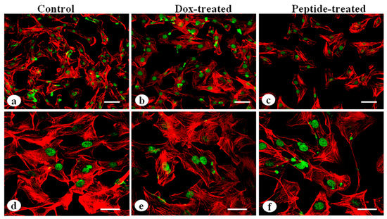 Cytoskeletal organization of MDA-MB-231 cells by actin immunostaining: (a,d) MDA-MB-231 cells without treatment, (b,e) MDA-MB-231 cells treated with doxorubicin, (c,f) cyclosaplin treated MDA-MB-231 cells (Scale bar = 50 µm and 20 µm).