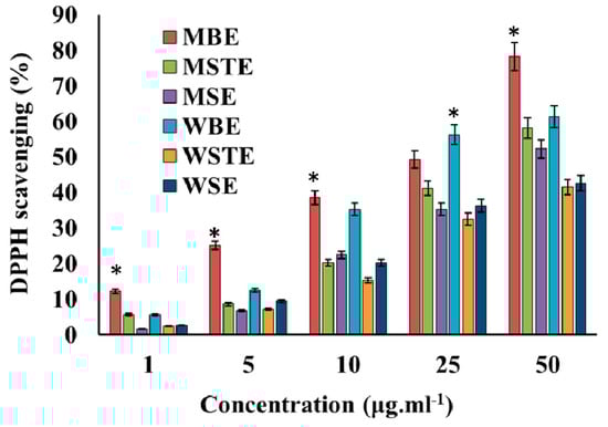 Antioxidant activity of the TVEs was determined in a DPPH scavenging assay. All the extracts significantly scavenged DPPH in a dose dependent manner (Figure 1). This activity also significantly varied between different types of TVE. Among the extracts, MBE exhibited higher activity (Figure 1). The total phenol content (TPC) and flavonoids content (TFC) were determined in the TVEs. The TPC ranged from 2.12 to 89.25%, and TFC varied from 1.02 to 15.62% in TVEs and both were found higher in the MBEs. Probably the higher content of the TPC and TFC present in the MBEs might be responsible for the higher antioxidant DPPH scavenging activity than other TVEs as there is a possible correlation between TPC and antioxidant activities [55,56,57]. The TVE is reported to contain bioactive phytochemicals including polyphenols, and flavonoids [5,57,58,59]. The TV has hydroxyl radicals [60] that protect human low-density lipoprotein (LDH), scavenge DPPH and –OH radicals and inhibit the linoleic acid oxidation [61,62]. The fruit extract of TV has glucose, glucose oxidase, and scavenge hydroxyl and free radicals [63].