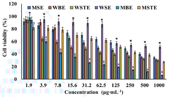 Cytotoxicity of different methanolic and water extracts of T. vernicifluum. Methanolic seed extract (MSE), methanolic bark extract (MBE), methanolic seed extract (MSTE), water seed extract (WSE), water bark extract (WBE), water stem extract (WSTE). Data are mean ± standard error (SEM, n = 3). * p < 0.05 is significantly non-cytotoxic to A549 cells than other types of extracts. ∆p < 0.05 is significantly cytotoxic to A549 cells than other types of extracts.