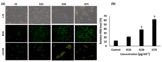 (a) Effect of the methanolic and water extracts of T. vernicifluum on cellular changes in A549 cells. (b) Relative reactive oxygen species level. IC—inhibitory concentration, LM—light microscopic images, ROS—reactive oxygen species, AO/EB—acridine orange and propidium iodide staining. Data are mean ± standard error (SEM, n = 3). The level of ROS is * p < 0.05 significantly varied with control treatment. The red scale bar in micrographs indicated the length of scale is 50 µm.