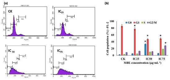 (a) Arrested the cell cycle of the human lung carcinoma A549 cells by the MBE treatments. Distribution of the cell cycle as determined by propodium iodide staining after the treatment of various concentrations of MBE. (b) Proportion of cells per cell phase in cell cycle. Data are as mean ± standard error (SEM, n = 3). * p < 0.05; M1—G0; M2—G1; M3—S and M4—G2/M.