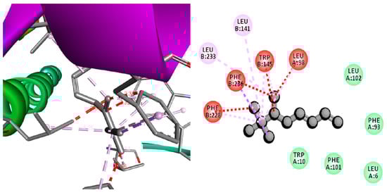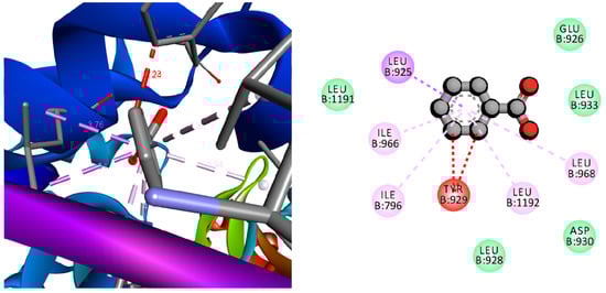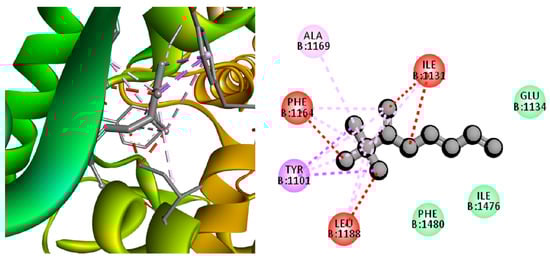 The molecular mechanism of MBE induced bacterial cell death as investigated by computational study and socking score is presented in Table 1. The results indicated that among the test compounds from the MBE, 2,3,3-trimethyl-Octane showed a high docking score (−13.74 Kcal/mol) against NBTI (4PLB) with the strong interactions in amino acids, such as hydrophobic side chain such as Ala1169, Leu 1188, Tyr1101, Phe1164, and Ile1131, electrically charged side chain Glu1134, (Figure 9). Furthermore, another compound benzoic acid exhibited a high docking score (−12.72 Kcal/mol) with interactions in hydrophobic side chain Leu925, Leu968, Leu1192, Tyr929, Ile796, Ile966, and Leu 925 of MRSA related protein (3ZFZ) (Figure 10). The in vitro, in vivo, and computational studies indicated that the antibacterial activity of MBE was due to the synergism of various compounds present in the MBE. The growth of bacterial pathogens can be inhibited through targeting of the growth and virulence protein topoisomerases II, IV, and DNA [23] as the new DNA gyrase inhibitor NBTIs is a potential target [24]. There are several works that indicate that targeting the NBTIs can be an excellent strategy for the development of a novel antibacterial agent [25,26,27] against MRSA [28]. Moreover, the penicillin-binding protein 2a (PBP2a) in MRSA will enhance resistance on β-lactams or other antibiotics. Similarly, in the present study, the compounds from MBE significantly metabolized the targeted proteins, which probably resulted in the inhibition of this protein expression in bacterial cells in favor of bacterial cell death. In addition, this work indicated that compounds, such as 2, 3, 3-trimethyl-Octane and benzoic acid from the MBE, were potent compounds against MRSA over the commercial antibiotic oxacillin (Table 1).