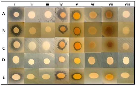 In vitro antibacterial activity of T. vernicifluum. Staphylococcus aureus (A), Salmonila enteria subp.enterica (B), Pseudomonas aeruginosa (C), E. coli (D), and Bacillus cereus (E); Antibiotics oxacillin (i), 200 µL of methanolic alone (ii), MSE (iii), MBE (iv), MSTE (v), WSTE (vi), WBE (vii), WSE (viii). methanolic seed extract (MSE), methanolic bark extract (MBE), methanolic seed extract (MSTE), water seed extract (WSE), water bark extract (WBE), water stem extract (WSTE).