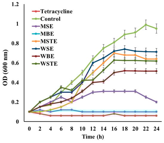 Analysis of the growth curve for antimicrobial activity of MIC concentration of different plant extracts against MRSA. methanolic seed extract (MSE-MIC:10.24 µg·mL−1), methanolic bark extract (MBE-MIC:7.12 µg·mL−1), methanolic seed extract (MSTE-MIC:9.25 µg·mL−1), water seed extract (WSE-MIC:8.75 µg·mL−1), water bark extract (WBE-MIC:9.21 µg·mL−1), water stem extract (WSTE-MIC:9.45 µg·mL−1). Data are mean ± standard error (SEM, n = 3). * p < 0.01 significantly varied with control.