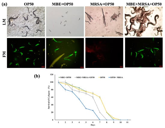 C. elegans life span assay. (a) Optical (LM) and fluorescent (FM) microscopic (10x magnification) observation of the live dead C. elegans after the propidium iodide or Syto-9 staining. (b) Determination of the C. elegans survival (%) during the 10 days of life span assay. Data are mean ± standard error (SEM, n = 3). * p < 0.01 significantly varied with negative control. OP50—E. coli OP50 normal food diet, MRSA—methicillin resistant Staphylococcus aureus, MBE—methanolic bark extract. The red scale bar in micrographs indicated the length of scale is 100 µm.