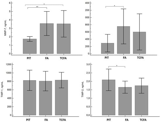 Distribution of the levels of matrix metalloproteinase (MMP)-7 and -9 and tissue inhibitors of matrix metalloproteinase (TIMP)-1 and -2 depending on the coronary plaque phenotype. The data are presented as the mean ± standard deviation. * P <0.05; ** P <0.005, as compared to PIT. PIT, pathological intimal thickening; FA, fibroatheroma; TCFA, thin cap fibroatheroma.