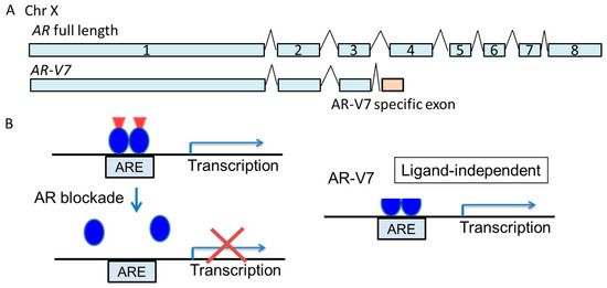 Genomic structure and transcriptional regulation by androgen receptor-variant 7 (AR-V7). A. A schematic of the genomic structure of the androgen receptor (AR) gene (exons 1–8) and the splicing variant, AR-V7. B. The AR-V7 protein lacks the ligand-binding domain of AR. Therefore, AR blockade by anti-AR drugs is not effective for tumors expressing AR-V7, because AR-V7 exerts ligand-independent transcriptional activity. ARE: androgen response element.