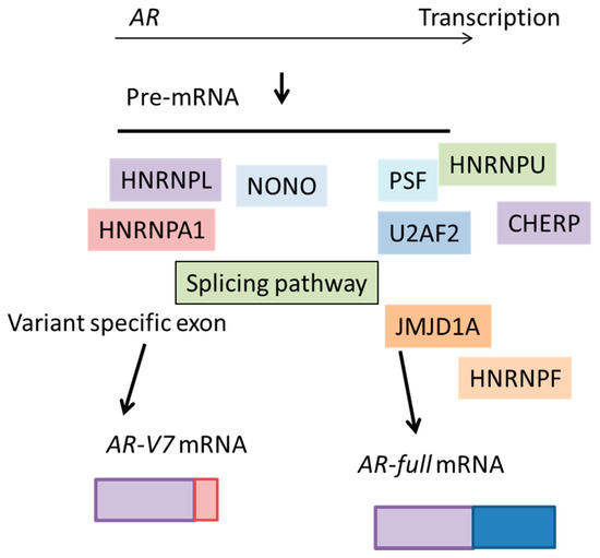The histone demethylase, Jumonji domain containing 1A (JMJD1A), was originally found to function as a key coactivator for AR through epigenetic regulation of H3K9 methylation marks [74,75]. Moreover, JMJD1A can also act to demethylate non-histone proteins in addition to histone H3K9 [76,77]. Another JMJ protein, JMJD6, an arginine demethylase and lysine hydroxylase, can regulate the alternative splicing through the hydroxylation of U2AF2 [78], suggesting the possibility of JMJ proteins as splicing factors. Indeed, JMJD1A was reported to be involved in the splicing of AR-V7 in prostate cancer cells [79] (Figure 4); mechanistically, HNRNPF was shown to interact with JMJD1A to promote this splicing event [79]. HNRNPA1 and HNRNPF function together to enhance the splicing events of some pre-mRNAs [68,79,80,81]. The JMJD1A–HNRNPF complex may interact with HNRNPA1-mediated AR-V7 splicing. The expression of JMJD1A was significantly associated with that of AR-V7 in prostate cancer tissue. Thus, the level of JMJD1A or factors that regulate the JMJD1A–HNRNPF interaction would promote the alternative splicing of AR-V7 in prostate cancer. Because increased levels of AR and AR-V7 are important for CRPC progression [21,56], current therapeutic strategies aimed at targeting AR are unlikely to have significant effects in prostate cancers expressing ARV7. Therefore, the finding that JMJD1A regulates the activity of AR and the generation of AR-V7 suggests that future development of specific JMJD1A inhibitors should be considered [79].