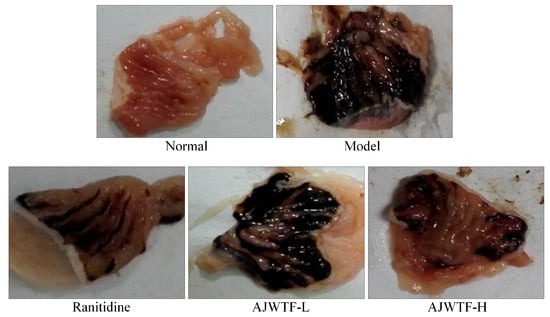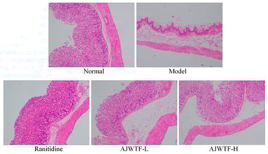 Specific pathogen-free (SPF) Kunming mice aged 6 weeks (male, body weight 20 ± 2 g) were purchased from Chongqing Medical University and fed with mouse basic feed and drinking water; the bedding material was changed once every two days for one week. The mice were divided into five groups with 10 mice each: the normal group, model group, low concentration AJWTF group (AJWTF-L group), high concentration AJWTF group (AJWTF-H group), and ranitidine group. The normal and model groups were given normal saline by gastric perfusion; the AJWTF-L and AJWTF-H mice were given 100 and 200 mg/kg AJWTF via gastric perfusion, respectively; the ranitidine group was given 50 mg/kg ranitidine for 14 days via gastric perfusion, and all experimental mice were fasted for 24 h on day 14. On day 15, all mice, except for those in the normal group, received an ethanol mixture (60% ethanol, 40% 150 mmol/L hydrochloric acid) 1 h after gastric administration, with 0.1 mL of ethanol mixture per 10 g of mouse body weight [15]. After intragastric administration for 30 min, blood from the eyeball was collected, and gastric tissue was dissected for use. The volume and pH of the gastric juice were measured (pH meter, PHS-25, Shanghai INESA Scientific Instrument Co., Ltd., Shanghai, China), while the degree of gastric mucosal injury was assessed intuitively. The inhibitory rate of gastric injury (%) = (1 − area of gastric injury/area of gastric tissue) × 100% was calculated using the inhibitory rate of the gastric injury after pictures were taken. The protocol for these experiments was approved by the Animal Ethics Committee of Chongqing Collaborative Innovation Center for Functional Food (201802003B) on February 22, 2018.