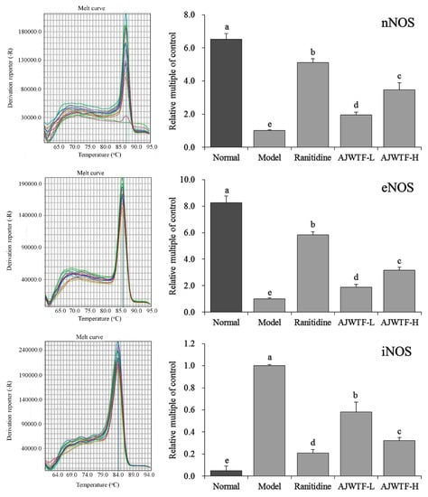Figure 3 shows that the expression levels of neuronal nitric oxide synthase (nNOS), endothelial nitric oxide synthase (eNOS), and inducible nitric oxide synthase (iNOS) were lowest in the model group. After AJWTF treatment, the expression levels of nNOS and eNOS in gastric tissues of mice with gastric injury increased significantly (p < 0.05), whereas that of iNOS decreased significantly (p < 0.05). The effect of AJWTF-H was stronger than that of AJWTF-L and similar to that of ranitidine.