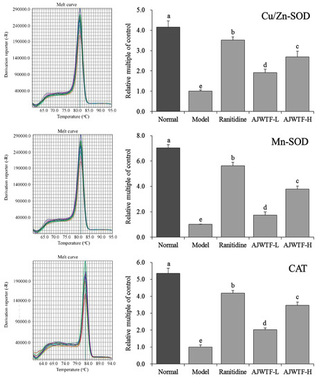 Figure 4 shows that the highest expression of Cu/Zn–SOD, Mn–SOD, and catalase (CAT) was observed in the liver tissues of mice in the normal group. The expression of Cu/Zn–SOD, Mn–SOD, and CAT in gastric tissues was significantly reduced by ethanol-induced gastric injury (p < 0.05). Both AJWTF and ranitidine could significantly inhibit the expression of Cu/Zn–SOD, Mn–SOD, and CAT in ethanol-induced gastric tissue injury (p < 0.05). With increasing concentration, AJWTF increased the expression of C/Zn–SOD, Mn–SOD, and CAT in gastric tissues. The higher the expression of Cu/Zn–SOD, Mn–SOD, and CAT was, the closer the effect exerted by AJWTF-H was to that of ranitidine.