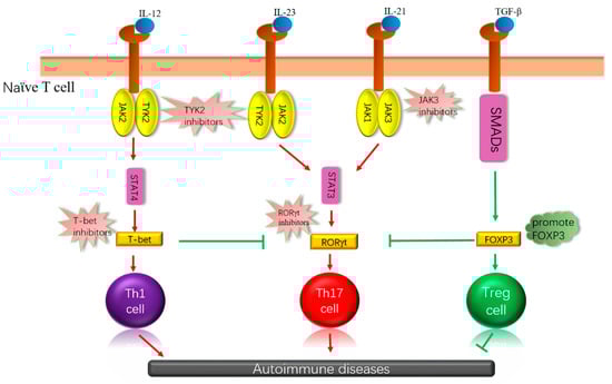 Cytokines are combined with receptors that can influence the differentiation of immune cells through different signaling pathways, which may have different effects on autoimmune disease. Some essential kinases and transcription factors are involved, which, depending on how they work, inhibit, or promote these kinases or transcription factors, can achieve the purpose of treating autoimmune diseases. IL: interleukin, JAK: Janus kinase; TGF-β: transforming growth factor β, SMADs: drosophila mothers against decapentaplegic, STAT: signal transducers and activators of transcription, T-bet: T-box expressed in T cells, RORγt: retinoic acid-related orphan receptor gamma t, Foxp3: forkhead box protein 3.