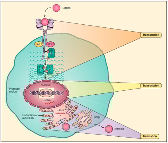 Transduction, transcription, and translation (the “three Ts”). These are the three steps in signaling pathways involved in protein synthesis, beginning with the binding of a ligand with a cell surface receptor initiating the first “T,” transduction, i.e., to lead across. This then proceeds to the phosphorylation of a number of cascading substrate molecules by kinases (i.e., phosphorylases) that results in the production of a transcription factor that binds to a promoter region of DNA within the nucleus. This then initiates the second “T,” transcription, i.e., to write across, during which messenger RNA (mRNA) is formed. After leaving the nucleus, the mRNA sits on a ribosome within the endoplasmic reticulum and acts as a “blueprint” to initiate the third “T,” translation, i.e., to carry across, culminating in the assembly of amino acids into a final protein. (Reproduced with permission from Bellanti, J.A. Immunology IV: Clinical Applications in Health and Disease. I Care Press: Bethesda, MD, USA, 2012) [].